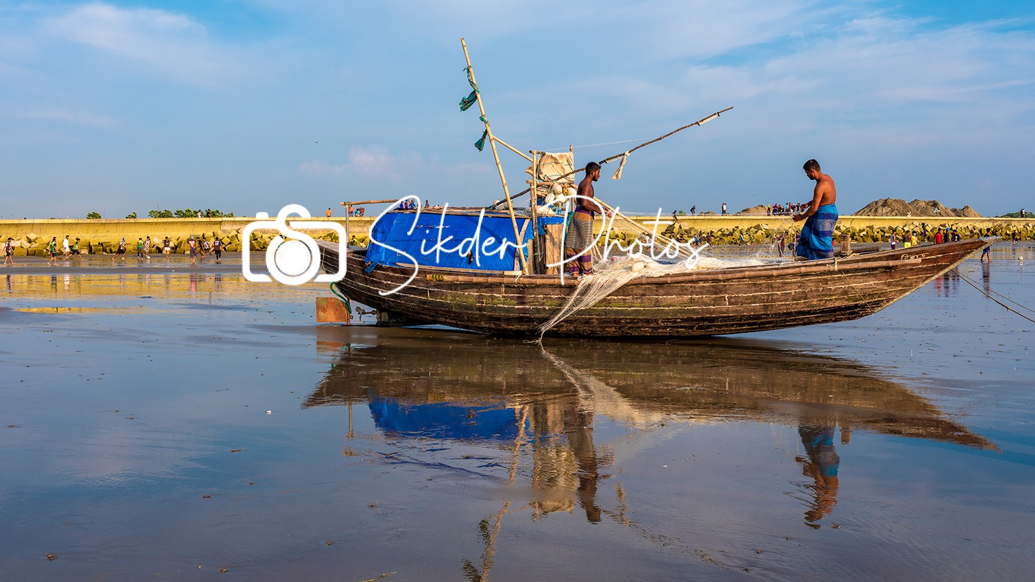 The fishermen standing on the lazy boat, their fingers dancing over frayed nets like seasoned weavers mending time itself. The tide has pulled back, leaving behind the scent of salt and seaweed, a fleeting pause before the sea reclaims its domain. Golden light spills over their shoulders, turning each knot and splice into a fleeting scripture—a language of patience and return.